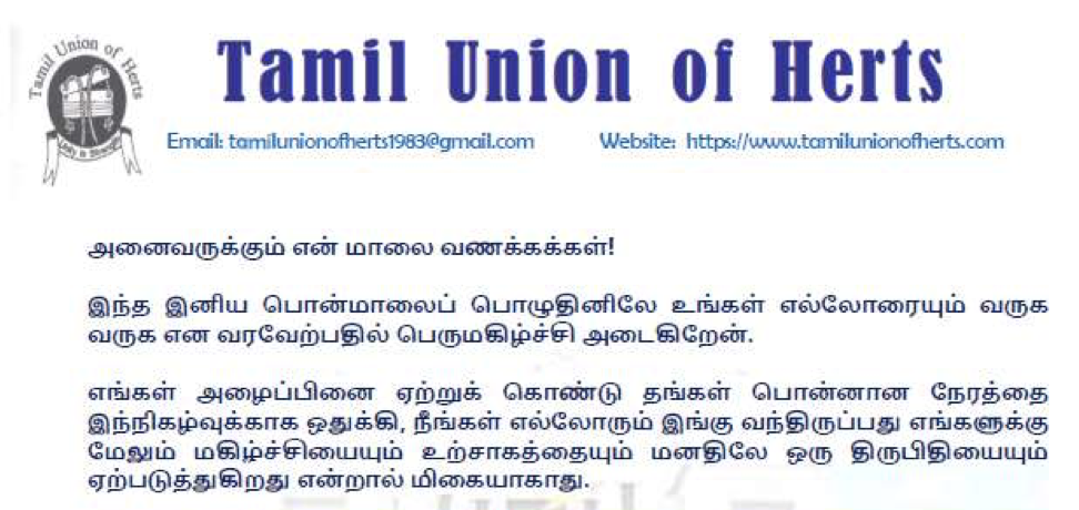 Tamil Union of Herts New Year party 4th january 2025 This event was held successfully at the Hollywell Community Center Pictures President's speech
