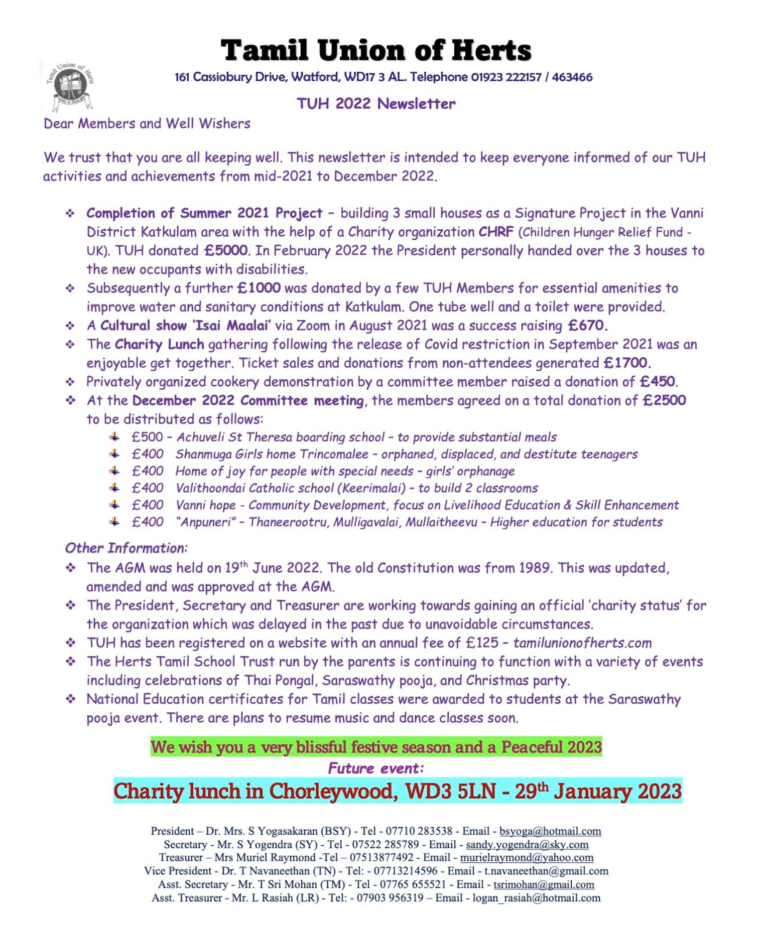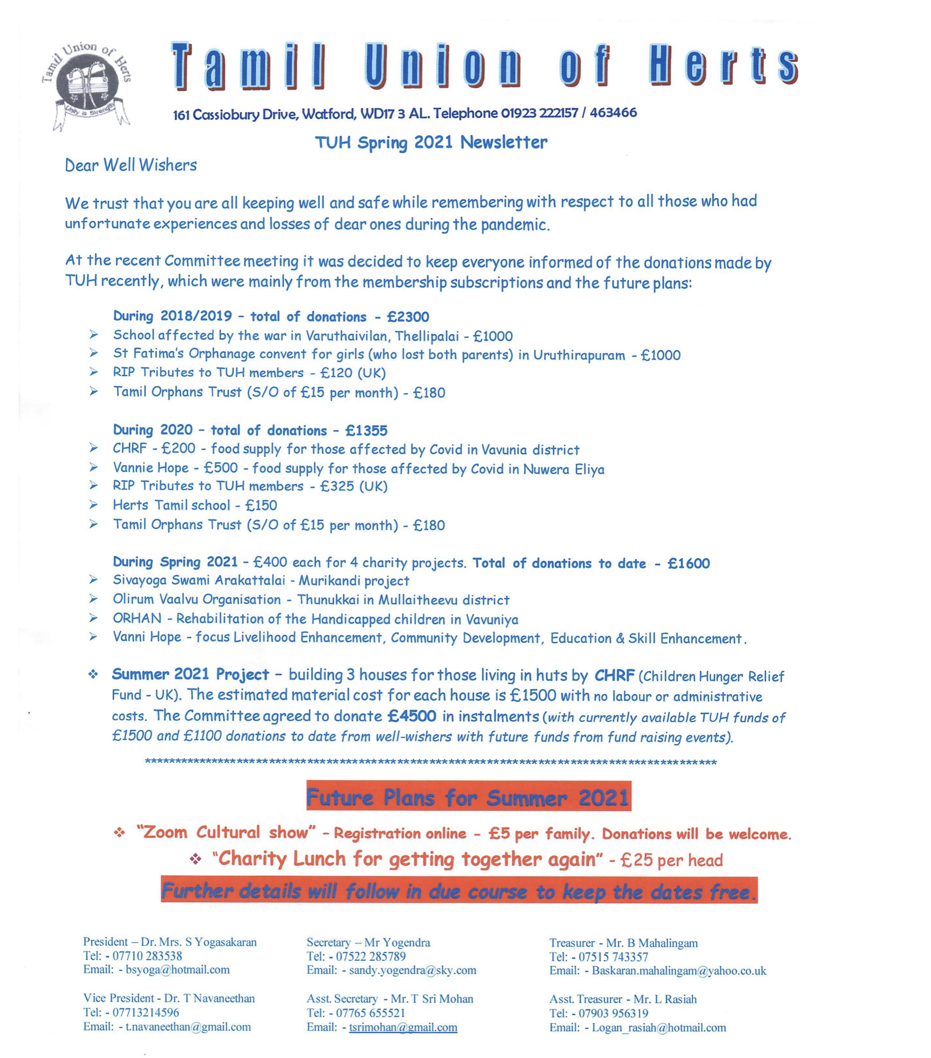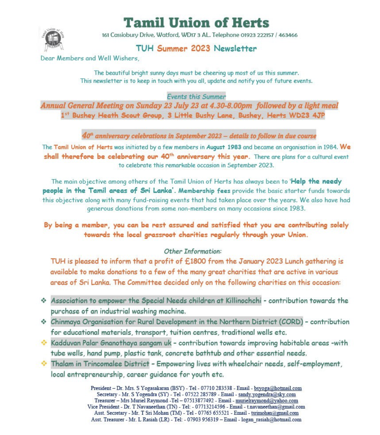 In addition to the £20 per person ticket the guests paid, a donation of £750 was received as donation from those who were not able to attend. A sum of £1035 as profit made was donated to the Tamil Union of Herts for the projects aimed at the needy people in the north and east of Sri anka.